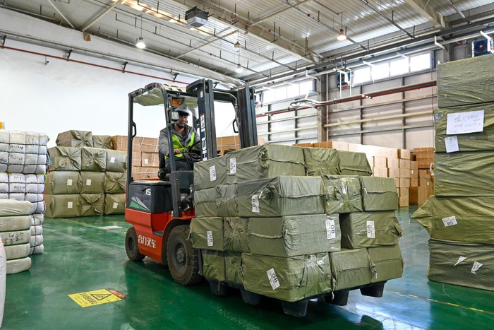 走进位于喀什综合保税区的中顺电子商务(新疆)有限公司,仓储大厅里,装有玩具、灯饰的货物整齐叠放,叉车进进出出,总经理张琪电话响个不停:“西方圣诞季快到了,公司进入业务高峰期。”