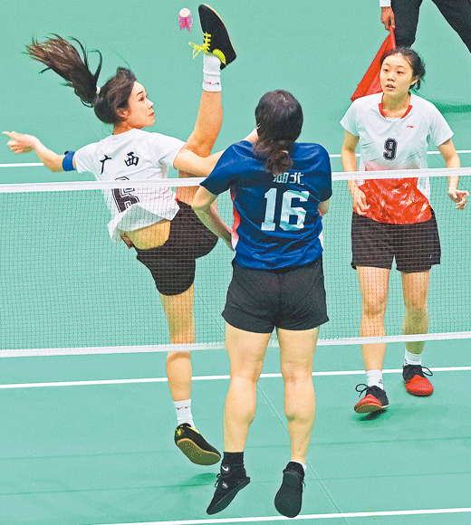 11月13日,首届学青会毽球项目(校园组)三人赛在广西民族大学(思源湖校区)进行。图为广西队员在大学女子组比赛中。记者 徐天保 摄