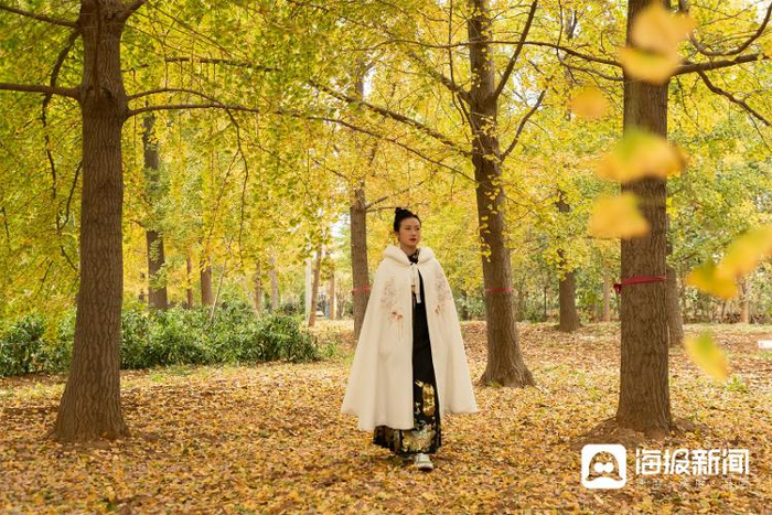 《银杏染初冬》2023年11月11日,山东枣庄滕州市官桥镇古薛生态银杏园,游人身着古装,漫步在银杏林中,感受自然之美。彭慧英摄