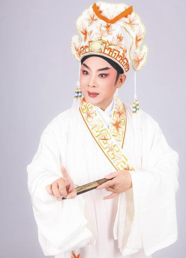 从现代琼剧到传统琼剧,时空上的穿梭,最先体现在演员穿搭造型上:在《红旗不倒》中,符传杰身着蓝灰色立领红军装,体现着人物的简朴干练;在《张文秀》中,一身嫩绿色长袍,头戴书生帽,挥舞着白色水袖,一位带着稚气的书生形象跃然眼前。
