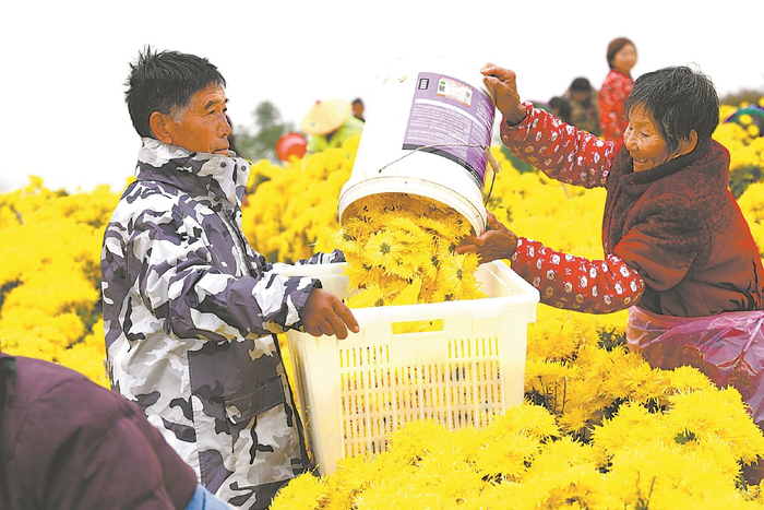 11月11日,肥东县古城镇合肥锦繁中草药种植专业合作社的农民在采摘金丝皇菊。这些金丝黄菊将由电商销往全国各地。本报通讯员 方 好 摄