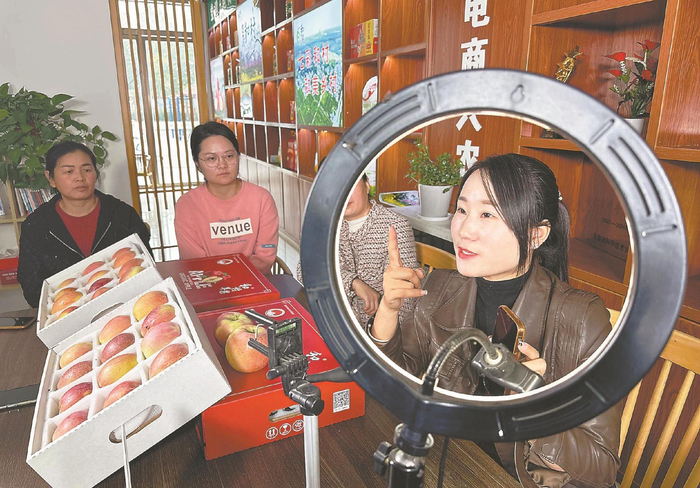 11月9日,淮北市烈山区商务局电商指导老师在“七彩和村助农直播间”向果农传授直播技艺,帮助他们拓宽苹果销售渠道。本报记者 李 博 摄