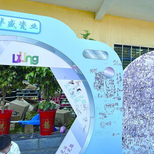 记者再次来到华盛瓷业,发现了很多新变化:墙上贴出标语“华彩盛世 如瓷美好”,立在门口的网红展牌非常显眼,设置在捡瓷区的签名墙,上面密密麻麻签满了名字,远道而来的游客纷纷与展牌合影。