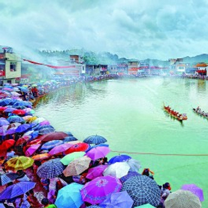 客家文化(赣南)生态保护实验区内举行的民俗活动杨村池塘龙舟赛,吸引了大批村民冒雨观看。李加淳摄/光明图片