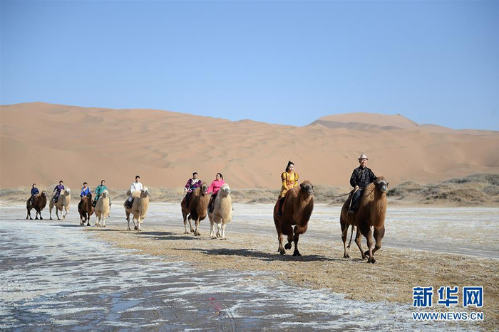 阿拉善盟阿拉善右旗乌兰牧骑队员前往巴丹吉林沙漠为牧民演出。