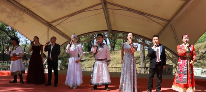 呼伦贝尔市新巴尔虎左旗乌兰牧骑队员用歌声为祖国庆生。