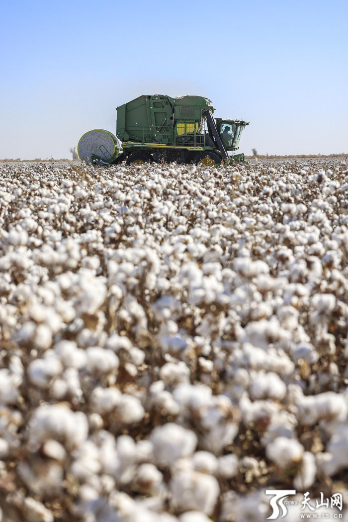 日前,库车景润农作物种植农民专业合作社社员驾驶大型采棉机采收棉花。今年,该合作社种植棉花1.1万亩,亩产预计可达370公斤。 袁欢欢摄