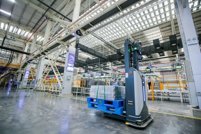 “机械手臂”翻箱、组装;不同型号箱体“混坐”电梯,通过空中廊道自由上下;自动运输车来回穿梭,将零部件码放整齐……走进美的冰箱荆州工厂,智能化体验扑面而来。