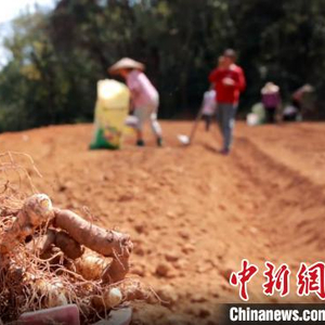 中新网永州11月26日电(陶冶)初冬时节,在湖南省祁阳市大村甸镇五爱村,20多名农户正在平整好的山坡上栽种中药材玉竹。