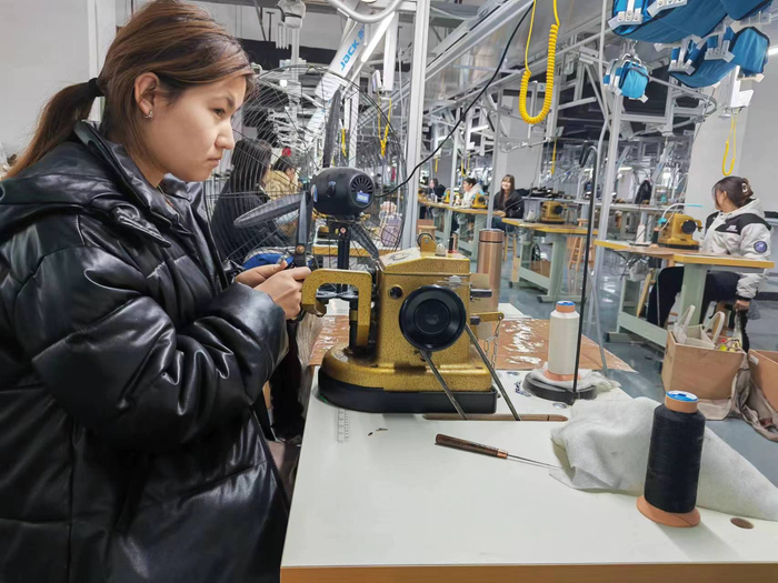 11月24日,在霍尔果斯裘皮实业有限公司的车间内,澎湃新闻注意到,有不少维吾尔族学生,正在跟着师傅认真地学习毛工、车皮等服装制作工序。