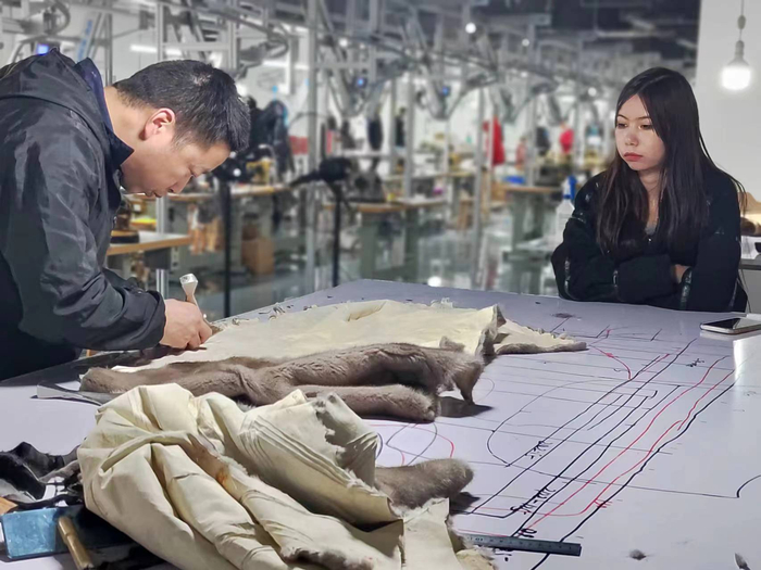 霍尔果斯裘皮实业有限公司车间内,师徒正在制作裘皮服装。 本文图片 澎湃新闻记者 谭君