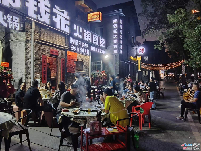 然而,当沉寂的夜晚被绚丽的灯光与斑斓的霓虹点亮,这里就成为了年轻人的“快乐属地”。穿着洪都小学校服的一年级小学生拿着十元纸币走进一家糖水铺,熟练地向老板买了三个钵仔糕;住在洪都附近的三个中年妇女相约一起来洪都地标前打卡,她们相互指挥拍照姿势,站在马路边拍摄视频发布在社交平台;沿街不时站着吆喝的餐饮店店员,玩偶雪王身边围了一群小学生……夜市除了有洪都大拇指、丽丽水煮、小邓土菜馆等一系列当地知名餐饮品牌外,还有小酒馆、密室、乐队驻唱等,欢笑声、干杯声、叫卖声不绝于耳。