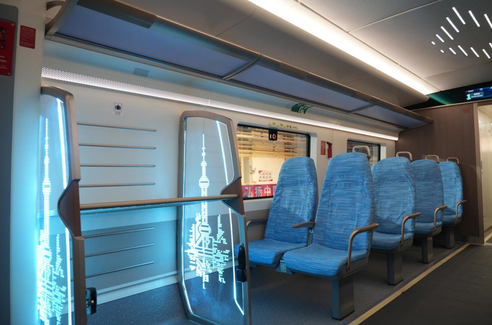 智能服务。列车具备智能灯光调节、压力波智能调节、无线充电、乘客人数智能计算等功能,为乘客出行提供贴心服务。
