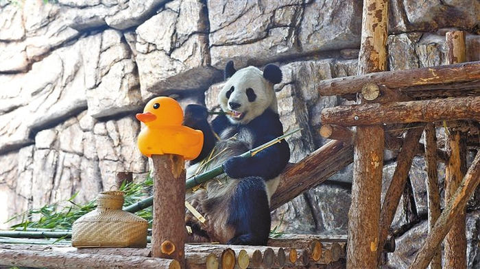 熊猫“茜茜”悠闲地吃竹子。