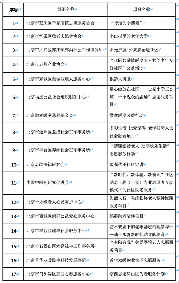 项目征集活动于今年10月20日启动,至11月17日结束,在全市征集到各类养老志愿服务项目共132个,经过项目初筛、专家终评等环节,“银龄大讲堂”等17个优秀志愿服务项目脱颖而出,被选定为2023年“银龄伙伴”为老志愿服务关爱行动资助项目。
