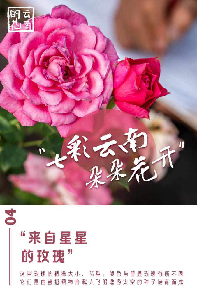 云南省安宁市现代农业园区玫瑰种植示范园里,一株株玫瑰美丽绽放。这些玫瑰的植株大小、花型、颜色与普通玫瑰有所不同。它们是由曾搭乘神舟载人飞船遨游太空的种子培育而成,因此也被称为“来自星星的玫瑰”。