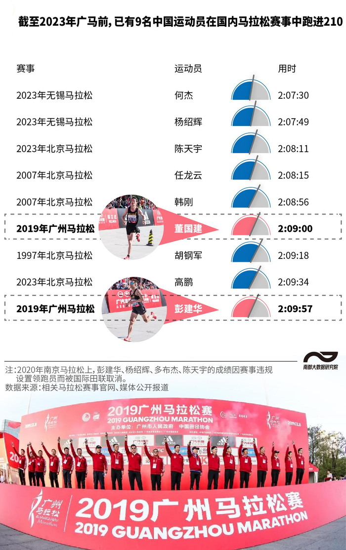 数据显示,截至2023年广马前,已有9名中国运动员在国内多项赛事中跑进210,其中两位更是在2019年广马创下的。四年前,董国建以2小时09分00秒的成绩获得2019年广州马拉松男子国内冠军,国际第四。彭建华以2小时09分57秒的成绩获得国内亚军、国际第六。两人的成绩均达标东京奥运会男子马拉松标准。虽然今年中国精英运动员在马拉松赛场屡创佳绩,也由何杰和杨绍辉分别在无锡马拉松和日本福冈马拉松两次打破男子马拉松的全国纪录,但董国建和彭建华在四年前广马所跑出的成绩,同样极具竞争力。