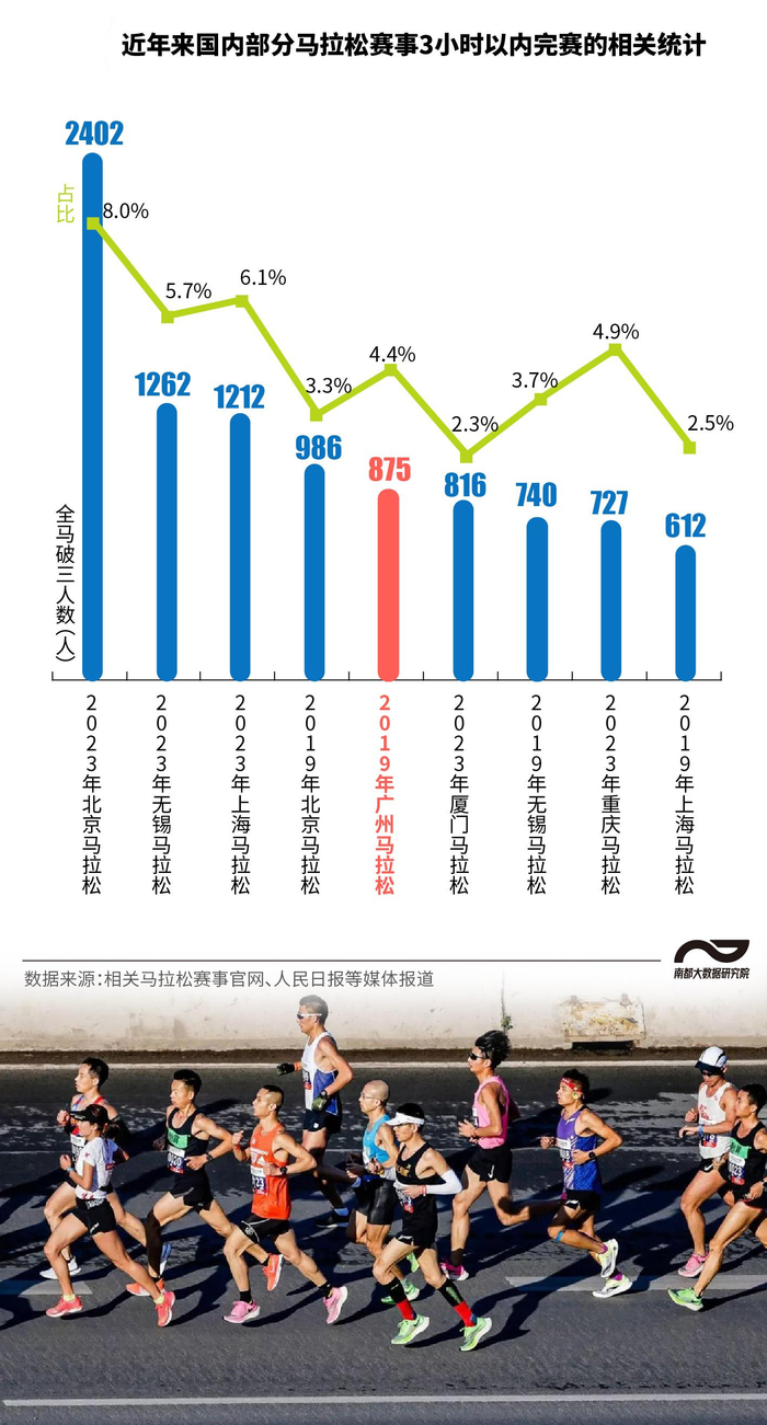 国内顶尖运动员展示了广马速度,那大众跑者呢?南都大数据研究院分析了一些热门赛事的“破三”情况。