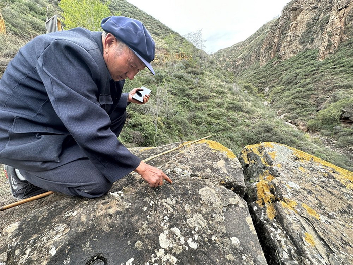 马进才老人向我们介绍岩画的形状。