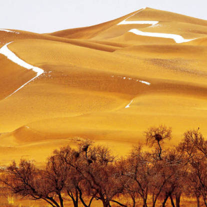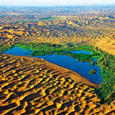 位于内蒙古阿拉善左旗的腾格里沙漠,有很多色彩鲜艳的盐湖。从高空俯瞰,它们或像枫叶、或形似心脏,颜色绚丽夺目,让单调的沙漠瞬间变成“斑斓世界”。