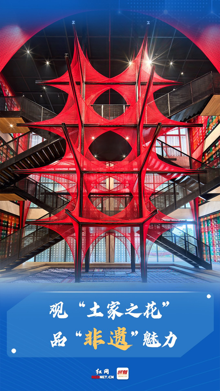 “这就是‘土家之花’,由15万米长的红线编织而成,寓意着将土家女人的勤劳、勇敢、坚毅编织成花,灿烂绽放。”