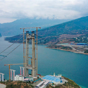 四川卡哈洛金沙江大桥是沿江高速公路控制性工程“三桥三隧”中技术最复杂、最具有代表性的控制性工程之一,位于四川凉山彝族自治州雷波县卡哈洛乡的溪洛渡电站库区,横跨金沙江,连接云南大永高速。大桥全长1817米(主跨1030米),为单跨双塔钢桁梁悬索桥,其新型框架基础重力式锚碇、内倾式钢管-混凝土格构柱、钢-混板桁结合桥道系,在悬索桥的历史上均属世界首创。