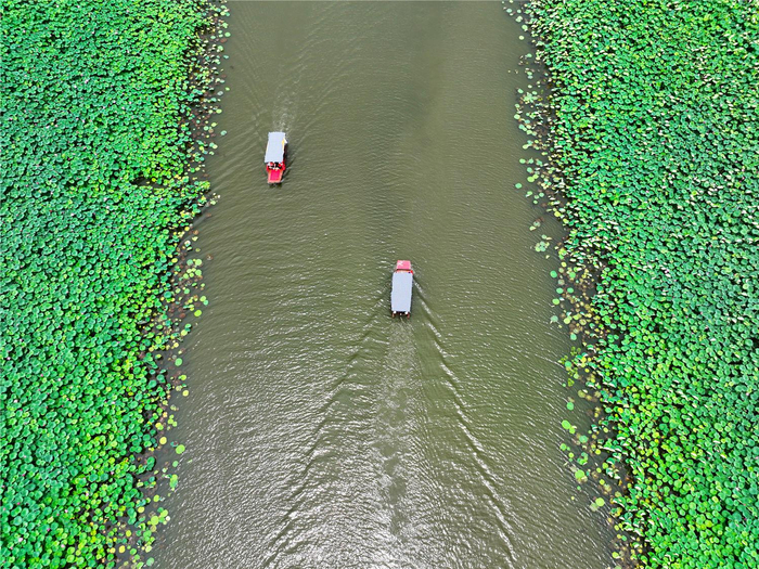 2023年7月9日,芜湖市湾沚区陶辛镇陶辛水韵荷花景区,游客或乘坐游船在荷花荡中游览,或在荷花从中赏花、拍照。本报通讯员 王玉实 摄