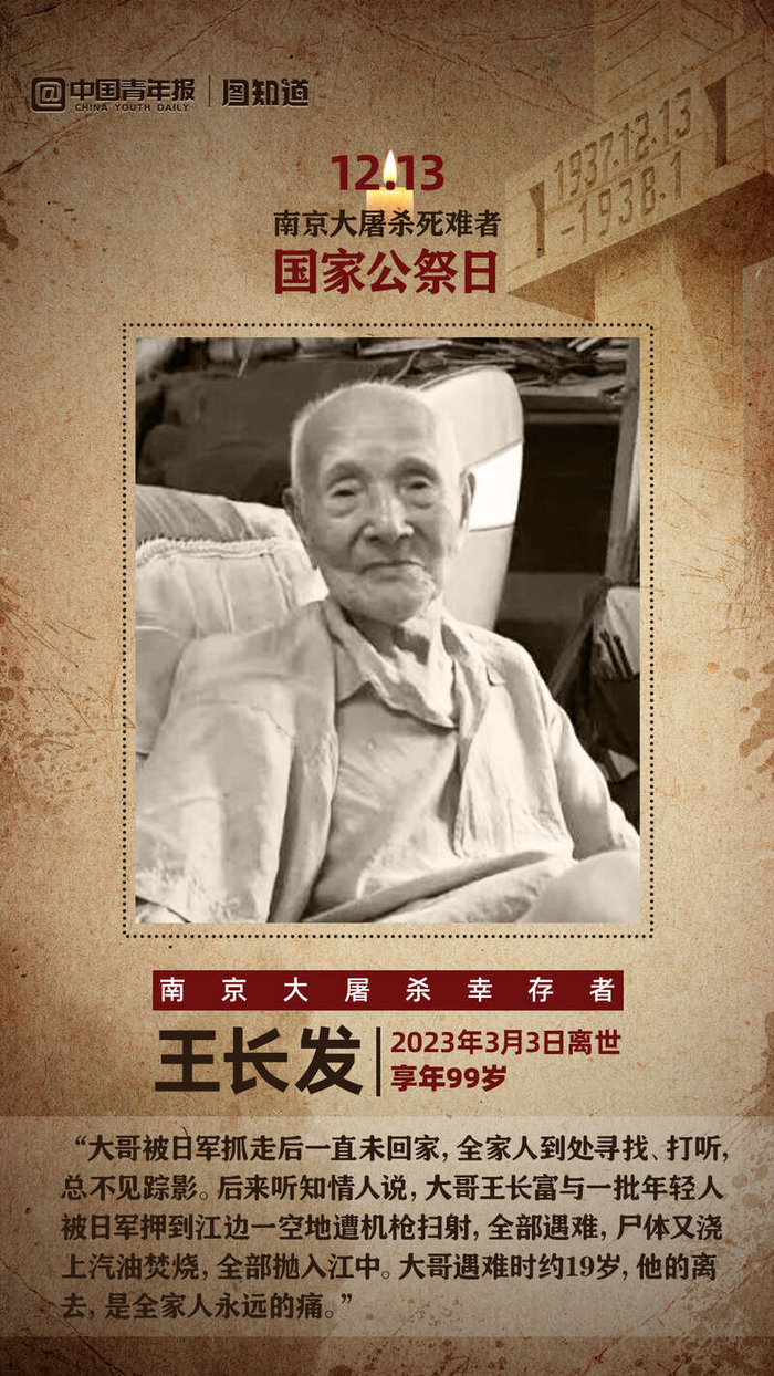 在侵华日军南京大屠杀遇难同胞纪念馆,有一面南京大屠杀幸存者照片墙。每有一位登记在册的幸存者离世,就会熄灭一盏灯。但是,他们在生前通过口述等方式将历史记忆留给了我们。一个个体的生命可能有尽头,但一个国家、一个民族的记忆将代代相传。今天是南京大屠杀死难者国家公祭日,共同走近这些老人,他们离去了,但我们可以点亮一盏名为记忆的灯。