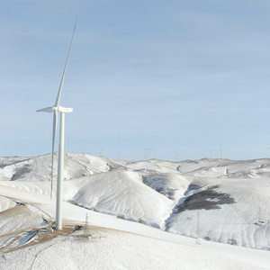 冬季草原上的风力发电机组。