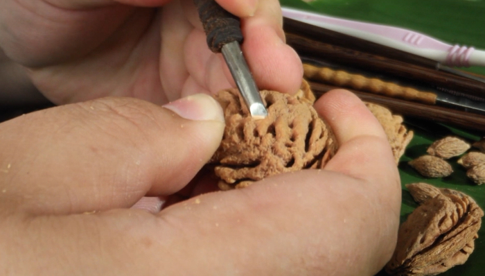 The sophisticated process of nut carving is like playing ballet on blade on the fruit pit, with the main tools being file, chisel and drill.