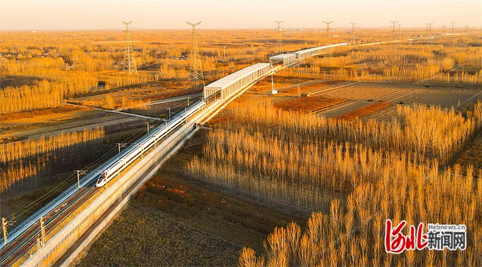 近日拍摄的高压防护棚。高压防护棚修建在津兴城际铁路与高压输电线路交叉段,为行车设备和高铁列车提供安全保障。 河北日报记者赵永辉摄