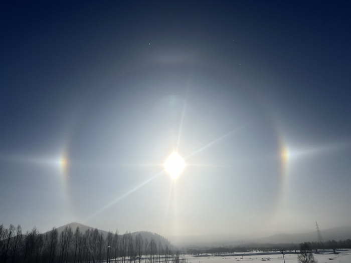 12月21日上午,内蒙古根河市上空出现罕见光晕景观,太阳周边被巨大的“日晕”光圈环绕,“日晕”外部出现彩虹色的环天顶弧,太阳左右两边出现一对“幻日”。20分钟后,环天顶弧消失,“幻日”“日晕”持续近1个小时后,也渐渐消失在空中。