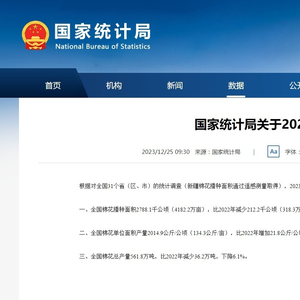 12月25日,国家统计局发布2023年棉花产量公告。数据显示,2023年全国棉花播种面积4182.2万亩。全国棉花单位面积产量134.3公斤/亩,比2022年增加1.5公斤/亩,增长1.1%。2023年棉花总产量561.8万吨。
