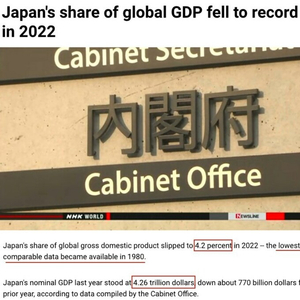 日本内阁府最新公布的经济年度核算报告显示,2022年日本名义国内生产总值(GDP)经换算后为4.26万亿美元,比前一年减少约7700亿美元,在全球经济中所占比重下滑至4.2%,比前一年下降0.9个百分点,创下自1980年有可比数据以来的最低水平。