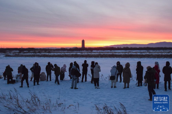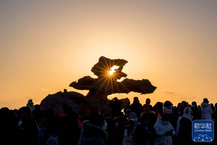 1月1日,游客在黑龙江省抚远市黑瞎子岛上看日出。新华社发(官长青摄)