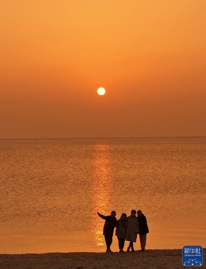1月1日,人们在山东青岛大沽河省级生态旅游度假区迎接新年日出。新华社发(王昭脉摄)