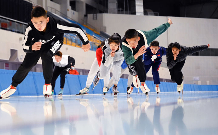 呼伦贝尔学院冰雪运动专业学生进行滑冰训练。