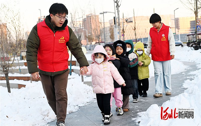 2023年12月20日,容东片区双文社区“双子星”志愿者护童小队“步行班车”护送孩子们安全放学。 河北日报见习记者 刘光昱摄