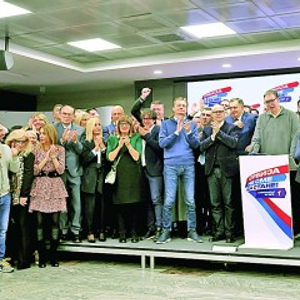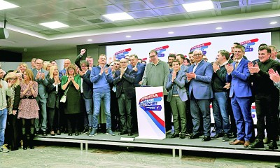 2023年12月17日,塞尔维亚总统武契奇在位于首都贝尔格莱德的塞尔维亚前进党总部宣布,以这一执政党为核心的党派联盟在当天举行的国民议会选举中获胜,赢得独立组阁所需的超半数议会席位。新华社发