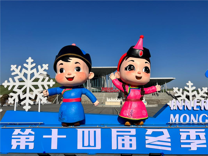 1月3日,呼和浩特市市民与“十四冬”吉祥物安达、赛努合影。随着“十四冬”日益临近,呼和浩特市多条街道、广场、车站等地都设置了“十四冬”吉祥物、道旗等,成为街头一道亮丽的风景线,将氛围感直接拉满。