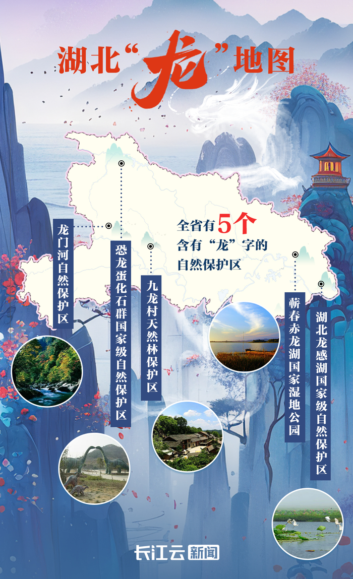 此外,全省还有5个含有“龙”字的自然保护区,分别是:湖北龙感湖国家级自然保护区、蕲春赤龙湖国家湿地公园、龙门河自然保护区、九龙村天然林保护区、恐龙蛋化石群国家级自然保护区。