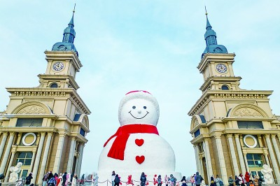 在哈尔滨群力音乐公园,众多游客前来与雪人合影。新华社发