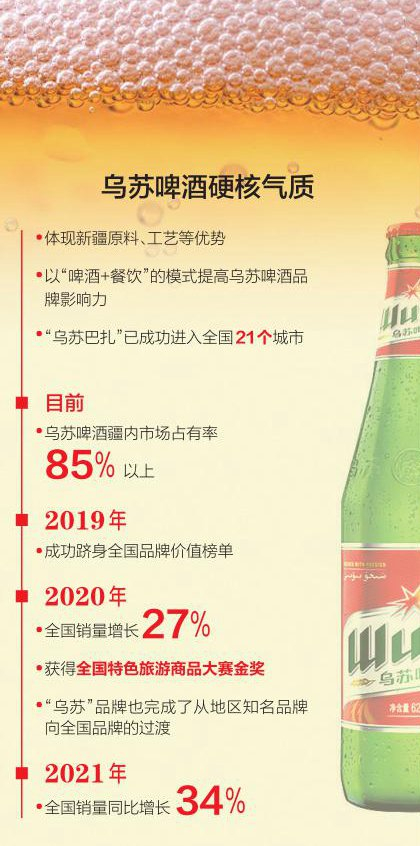 38年前,第一瓶乌苏啤酒下线,几乎没人会想到这个来自县办小厂的产品将在激烈的竞争中成长为全国性啤酒品牌。如今,乌苏啤酒成功跻身全国品牌价值榜单,获得全国特色旅游商品大赛金奖,成为新疆特色优势产品走向全国市场的成功经营样本。