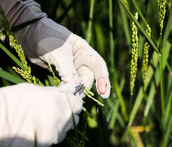 青岛海水稻研究发展中心的科研人员在位于三亚的国家南繁科研育种基地里做水稻杂交实验(2023 年 2 月 22 日摄) 张丽芸摄 / 本刊