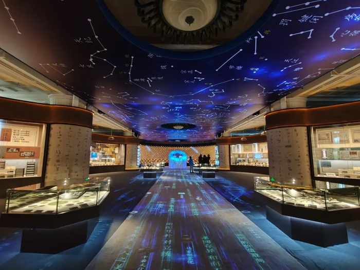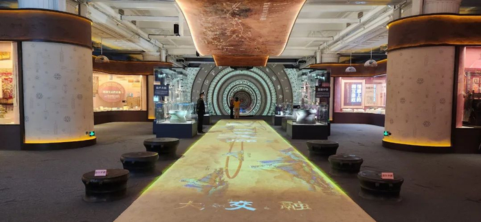 步入第一单元“大一统”展厅,映入眼帘的顶上古代天文图蕴含《易经》“观乎天文,以察时变”思想,表达了中华先民“天人合一”的宇宙观;地面上“流淌”着的文明之河,寓意《易经》之所言“观乎人文,以化成天下”,象征中华文明的源远流长、生生不息。