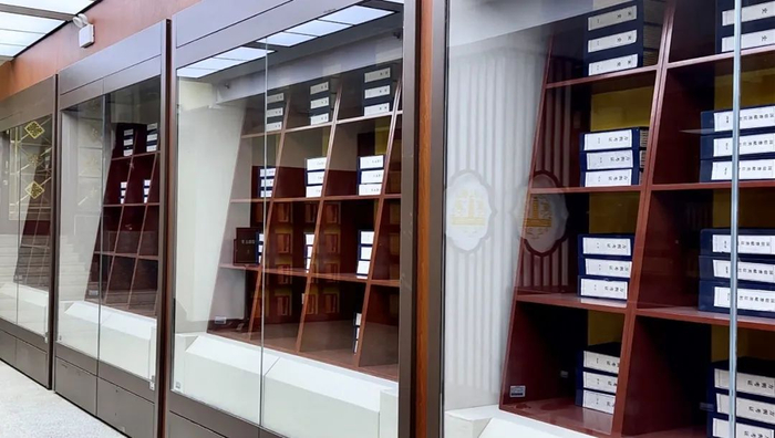 除了琳琅满目的展品,该展厅后方的一整面花瓣古籍墙别具巧思,以花瓣为造型,取“瓣瓣不同、瓣瓣同心”之意。每个花瓣中都珍藏有中华文化典籍,按下花瓣,一个个装着不同古籍复制品的小书盒便会缓缓移出。公众可在展览的互动过程中了解古籍保护及其记载的历史故事。