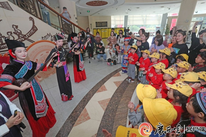 “小东北虎”欣赏壮族天琴弹唱非遗展演。