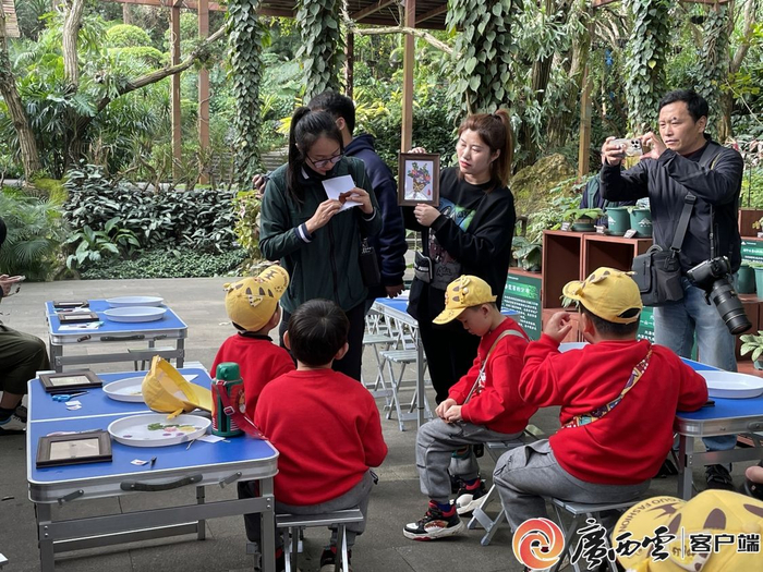 “南宁一年四季都有花开,小朋友们你们知道这是什么花吗?”当天上午,在青秀山风景区工作人员的介绍下,“小东北虎”们走进兰园,听讲解、赏兰花,一路探寻青秀山植物种类的多样性,认识不同颜色、品种的兰花,期间还遇到了可爱的“孔雀精灵”;在荫生植物园里,“小东北虎”们仔细寻找和观察林荫下那些有趣的植物,比如会“跳舞”的神奇植物,并动手学习制作干燥的植物标本,将压花工艺品带回家。