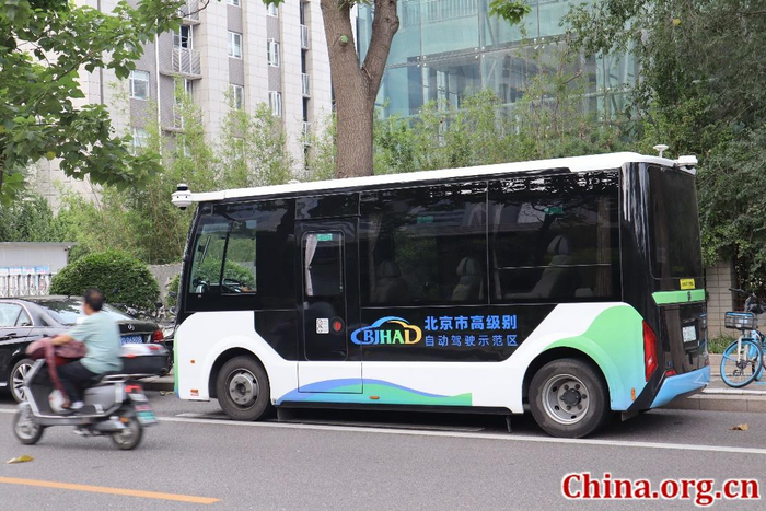 A self-driving bus parks at the curb in Beijing's Economic and Technological Development Area, Aug. 28, 2023. [Photo by Yan Bin/China.org.cn]