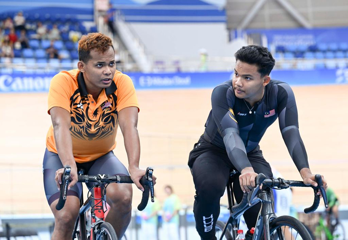 ↑2023年9月28日,马来西亚选手里德万(右)与哥哥沙阿在场地自行车男子争先赛前交流。